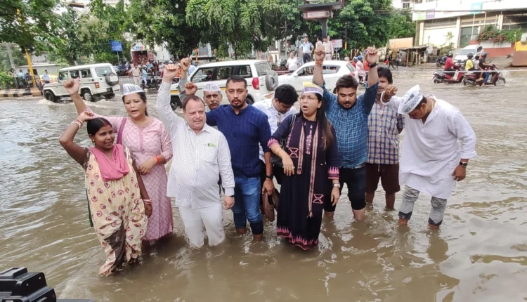 Guwahati: A large number of Aam Aadmi Party (AAP) leaders and workers protested today, calling for action on the issue of artificial floods in Guwahati. Led by AAP leaders Romen Borthakur and Anurupa Dekaraja, the protest took place in Rukminigaon, urging the state government and the Guwahati Municipal Corporation to address the problem.