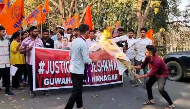 Guwahati: The Akhil Bharatiya Vidyarthi Parishad (ABVP) has vehemently condemned the appalling incidents of sexual exploitation of women in Sandeshkhali, North 24 Parganas district of West Bengal. ABVP organized a protest march in Guwahati, demanding justice for the victims and holding the state government accountable for sheltering criminals responsible for these atrocities.