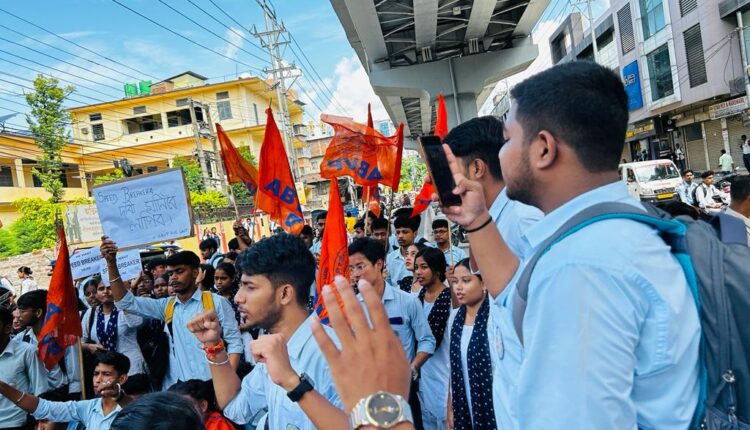 Guwahati : The ABVP unit at Arya Vidyapeeth College organized a protest demanding a speed breaker on the main road in front of the college gate. The student community expressed their anger after a road accident injured pedestrians due to the absence of speed breakers near the college.