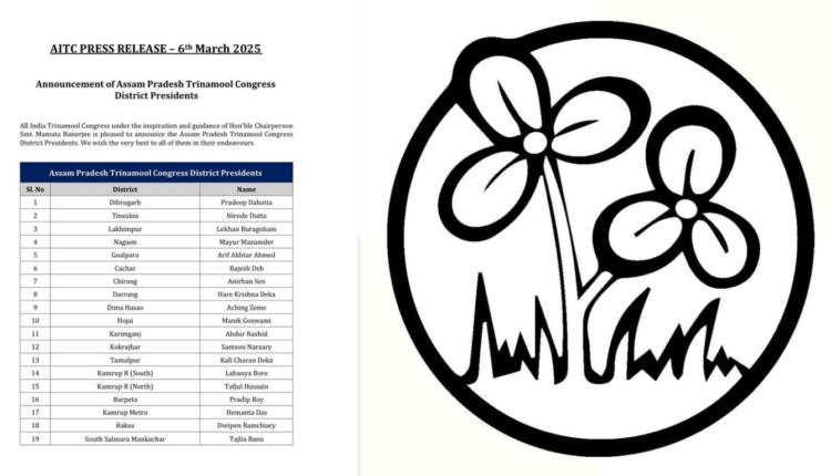 Guwahati: The Assam Pradesh Trinamool Congress has announced new district presidents with the approval of party chief Mamata Banerjee. The appointments include Pradeep Dahotia (Dibrugarh), Nirod Dutta (Tinsukia), Lekhon Buragohain (Lakhimpur), Mayur Majumdar (Nagaon), Arif Akhtar Ahmed (Goalpara), Rajesh Dev (Cachar), Anirban Sen (Chirang), Harekrishna Deka (Darrang), Asing Jim (Dima Hasao & Hojai), Lavanya Boro (Kamrup South), Tafzul Hussain (Kamrup North), Pradeep Roy (Barpeta), Hemant Kumar Das (Kamrup Metro), Dipen Ramsiya (Baksa), Tajliya Banu (South Salmara-Mankachar), Harunur Rashid (Bajali), and Sahidur Rahman (Dhubri).
