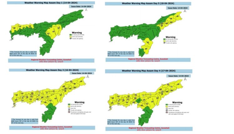 - 14th April 2024: Light to moderate rainfall expected at isolated places, with thunderstorm and lightning likely to occur at isolated places over districts including Kokrajhar, Chirang, Baksa, Tamulpur, Hojai, East Karbianglong, and Golaghat.