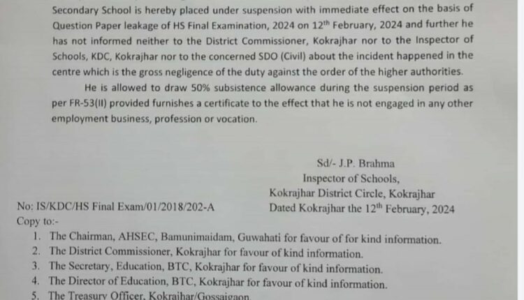 Following the revelation of the paper leak, the Director of Education, BTC, took swift action by ordering the suspension of the school’s principal, identified as Ramendra Nath Roy. Additionally, a departmental inquiry has been initiated to investigate the matter thoroughly and to determine appropriate actions against the principal. The inquiry report will be submitted to the office for further necessary steps.