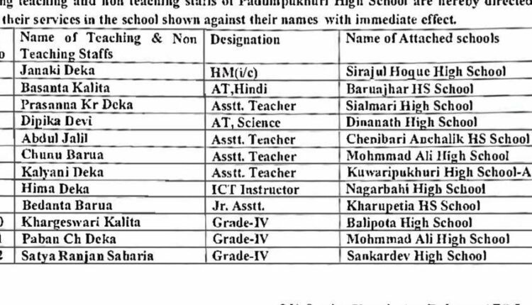 Education Minister Ranoj Pegu confirmed the transfers in a social media post, stating that the Office of the Inspector of Schools, Darrang, issued the order. The transfer affects both teaching and non-teaching staff, including the in-charge principal, Janaki Deka.